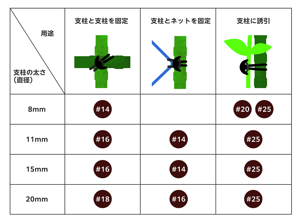 たばねバンドなら、用途や支柱に応じた5つのサイズがあるので、ヒモのように長さを測って切る手間がありません。