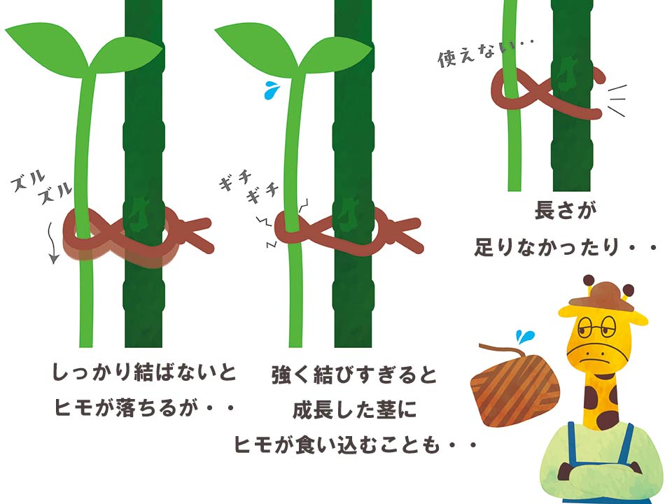 ・茎に食い込まず、ずり落ちない程度の絶妙な力加減で結ぶ手間