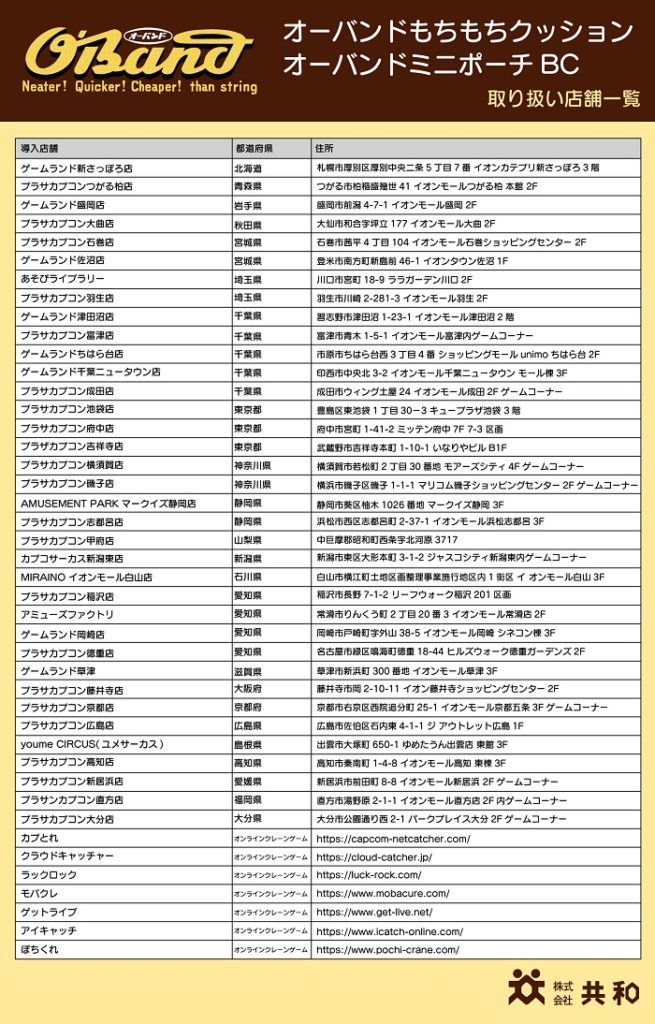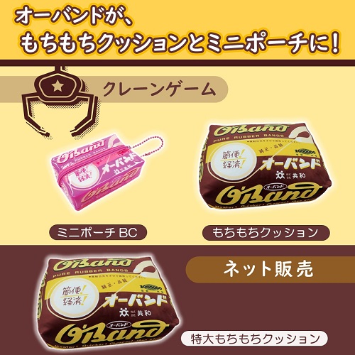 オーバンドの「もちもちクッション」「ミニポーチ」が、12月下旬よりカプコン他ゲームセンター内クレーンゲームの景品として登場します。